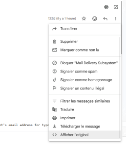 Ouvrez l’e-mail et cherchez la partie « afficher l’original » / « show original ».